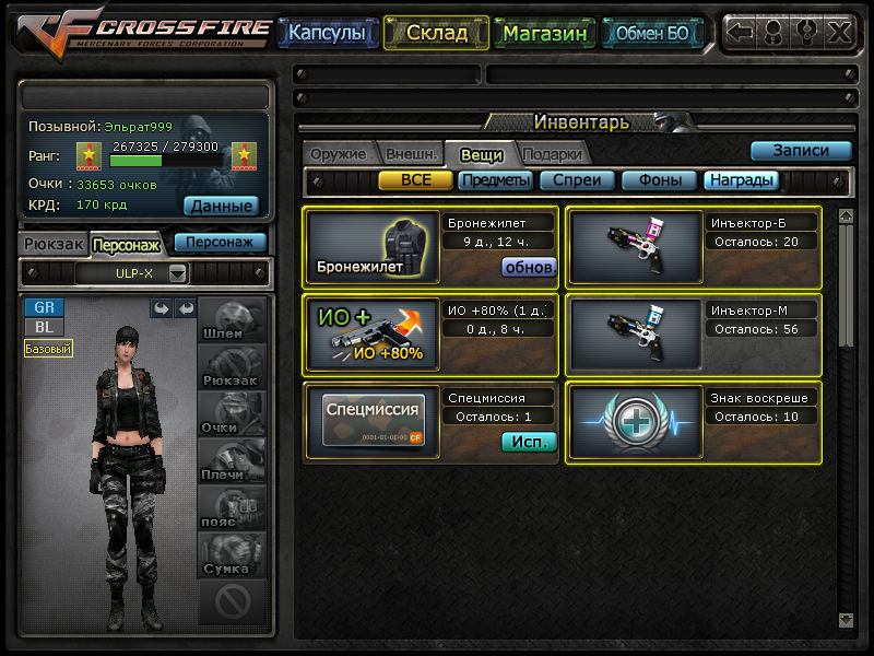 Среди вещей у меня есть 20 покупных (купил для коллекции), 56 обычных инъекторов (с режима "Зомби" насобирал), 10 знаков воскрешения (достались мне в новогоднем подарке), 1 спецмиссия (покупал), Бронежилет (бонусом достался) и тот самый эффект с 80% дополнительных призовых очков с предыдущей спецмиссии.