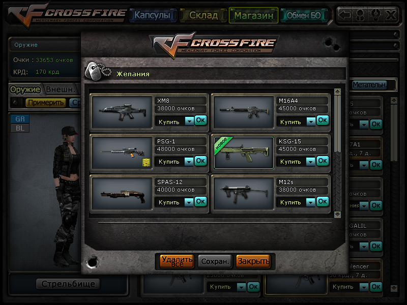 Немного расскажу, чем определен выбор покупки обычного оружия (за очки). Также сразу расскажу о тех видах оружия, которых у меня сейчас нет, но я хочу их со временем купить. В Игровом магазине есть возможность поместить оружия "в желание" - т.е в отдельный список избранного, чтобы не искать потом оружия, которые ты хотел купить по всему магазину. Вот мой список оружия, которые я поместил в список желаемого.