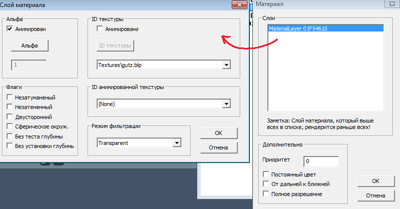 Часто бывают моменты, когда у модели в обычном формате все нормально, а в редакторе аним у модели встречаются дырки (не хватает между точками плоскостей). Это тоже зависит от кнопки Обратить нормали (5). Регулирование отображение плоскости (или тень, или пустота) настраивается в War3 Model Editor 1.07 -> Окна -> Редактор материалов. В редакторе материалов появляется вот такой вот список (кол-во пунктов может изменяться).