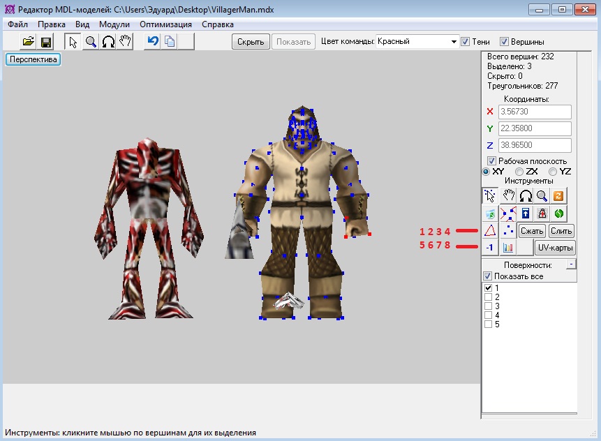 - Слить - похожая кнопка, но она не только сжимает точки в одном месте, но и сжимает отображение текстуры. Причем, при нажатии этой кнопки часто выскакивают ошибки. Поэтому прежде, чем пользоваться кнопкой, сделайте копию модели.