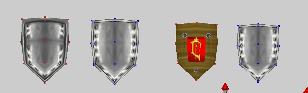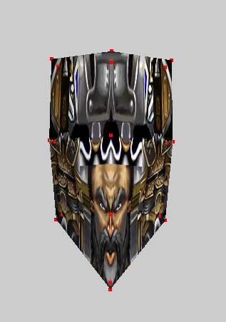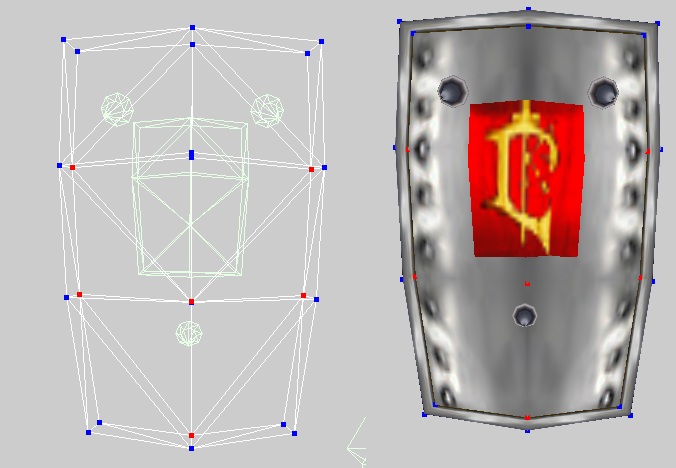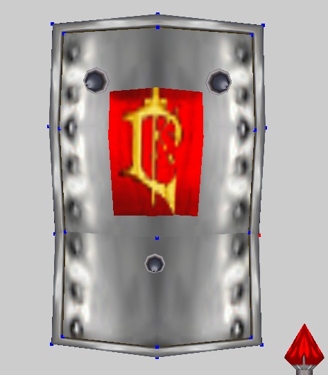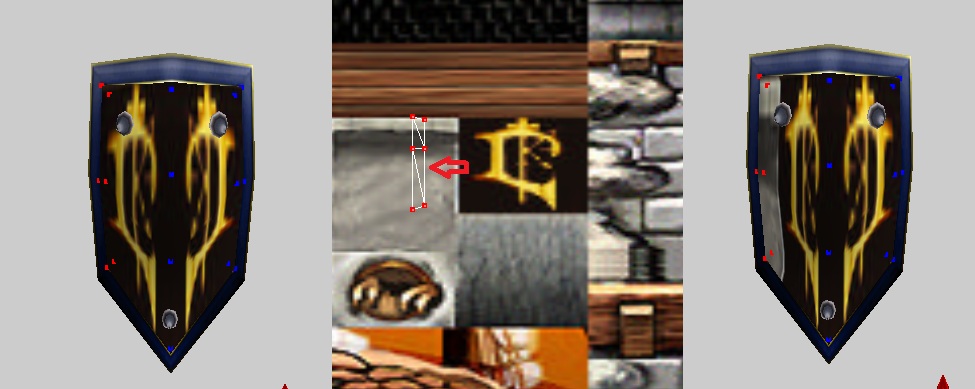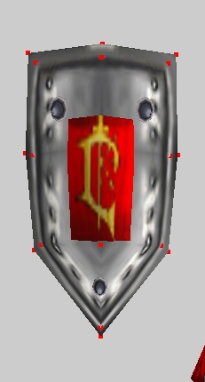 Вновь открываем редактор текстур, соединяем точки и располагаем модель по всей текстуре герба (1 скрин). Время добавить тимколор - через War3 Model Editor 1.07. Как это делать, я уже много раз говорил, повторяться не буду. И получаем результат (2 скрин). Теперь надо поправить немного форму щита. Смотрим 3 скрин: сначала боковые нижние точки опускаем вниз, чтобы герб получился более прямоугольный. Потом уменьшаем это в размере, выдвигаем немного вперед сам герб, а потом дополнительно нижние центральные точки, чтобы он (т.е. герб) был виден. Пока оставляем так, в дальнейшем может чего и поменяем. Теперь нужно разобраться со второй частью щита, основной.