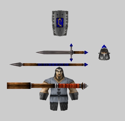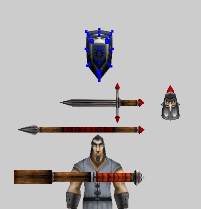 Начнем с щита. Щит можно взять с модели меню Альянса в Reign of Chaos (то самое меню, где стоит пехотинец у ворот замка). На первом скрине показаны папки, где находится данная модель. Нам понадобятся поверхности 18, 50 и 51. Выделяем в них щит (почему выделяем именно щит - потому что в 18-ой поверхности еще есть тело, оно нам не нужно) и копируем с помощью Спец вставки в нашу модель рыцаря. Щит уменьшаем в размере, двигаем к центру, чтобы он нормально отображался, и с ним было удобно работать. Что получается (2 скрин).