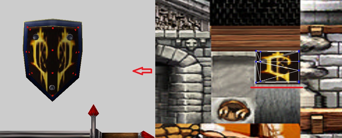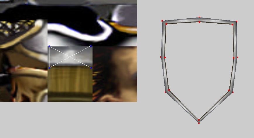 Теперь возьмемся за рамку. Выделяем точки рамки, копируем и вставляем обычной вставкой (1 скрин). Ненужные 2 треугольника удаляем с помощью кнопки Удалить треугольник. Удаляем тем же способом рамку-исходник. Открываем рамку в редакторе текстур и складываем все 3 прямоугольника друг на друга, чтобы в итоге получился 1 (2 скрин). Полученный прямоугольник я повернул на бок и расположил, как на 3 скрине. Теперь соедините 2 части - рамку и лицевую сторону щита (те 2 части, над которыми мы до этого работали).