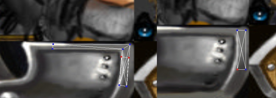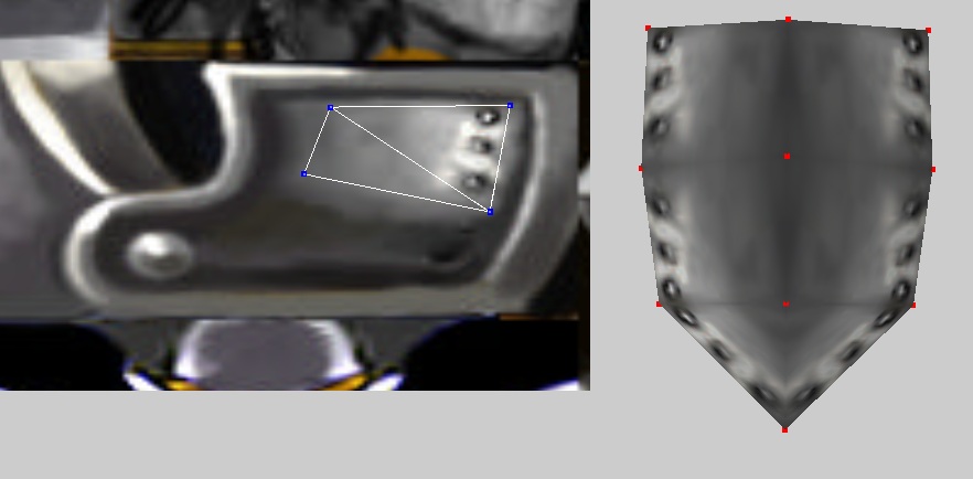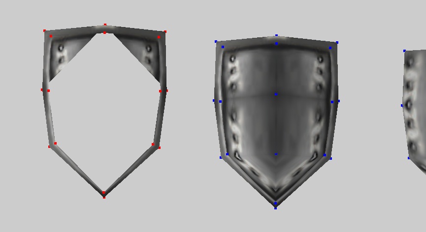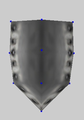 Займемся нашей копией лицевой части. Открываем редактор текстур и сжимаем верхние точки (1 скрин). После немного меняем их положение и получаем (2 скрин). Дальше я отразил текстуру по Y и немного поправил точки до варианта, как на 3 скрине, и получил (4 скрин). Дальше я выделил самую нижнюю точку, открыл редактор текстур и чуть поднял ее. Теперь на низу щита есть еще одна небольшая заклепка (5 скрин).