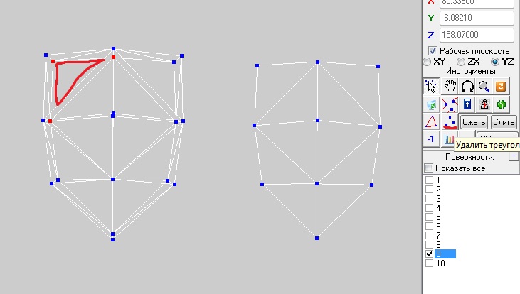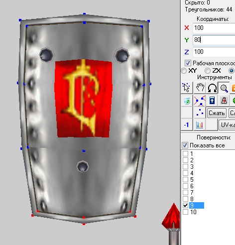 Теперь нужно ровнять текстуру. Выделите точки, что на 1 скрине, скопируйте их и вставьте копию обычной вставкой. Потом выделите каждый треугольник оригинала (путем нажатия на него - так сразу выделяются нужные нам 3 точки) и удалите его с помощью кнопки Удалить треугольник (2 скрин). В итоге у нас получается копия лицевой части щита и сам щит с рамкой (3 скрин).