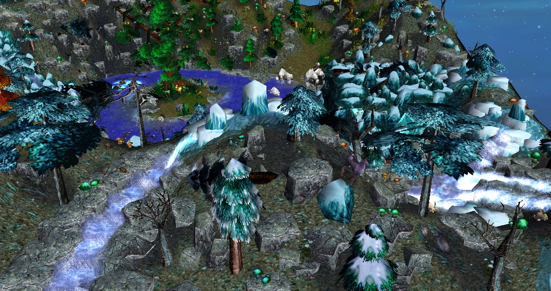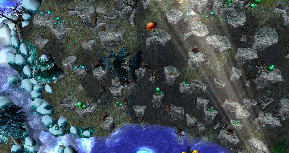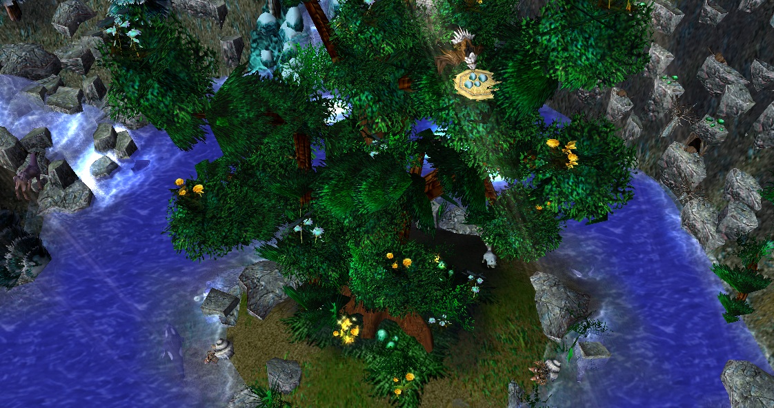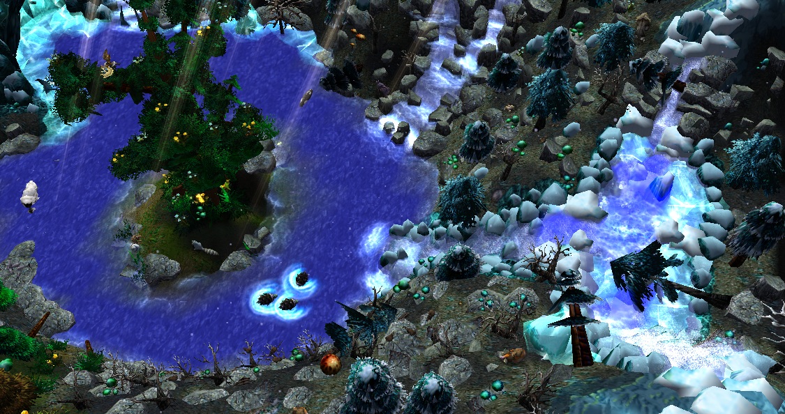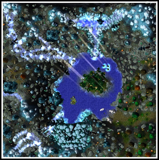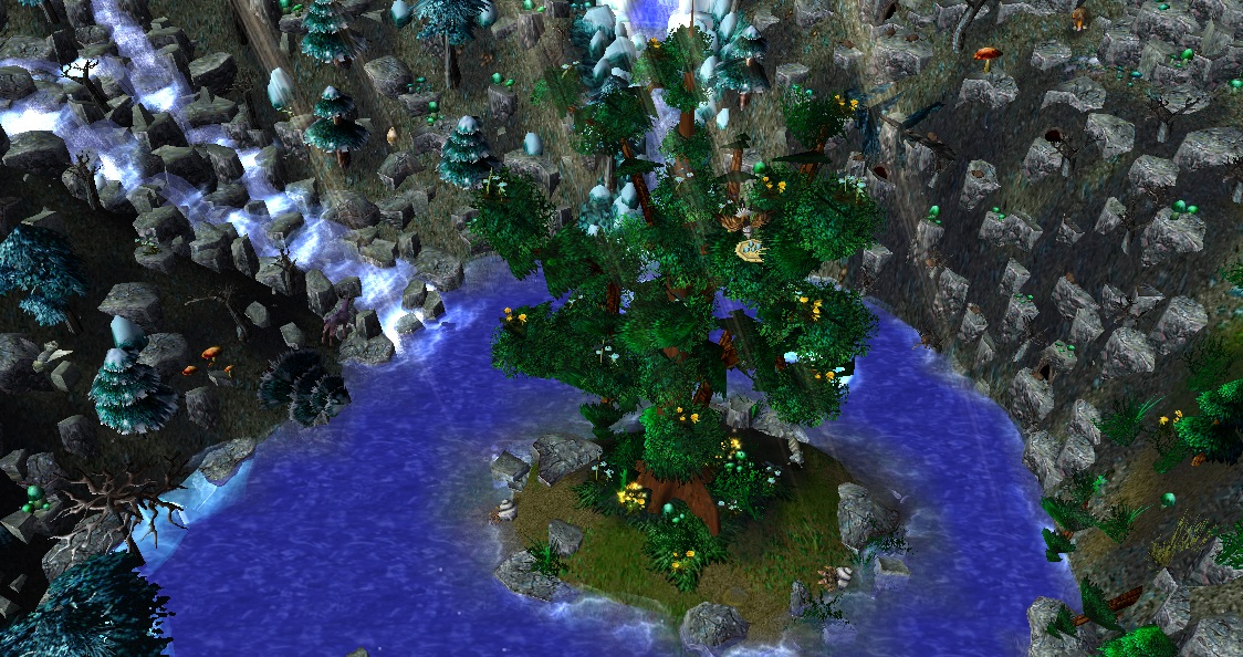 - Центральное озеро с небольшим островом и древним деревом на нем (единственная "теплая" зона на карте).