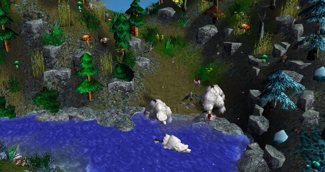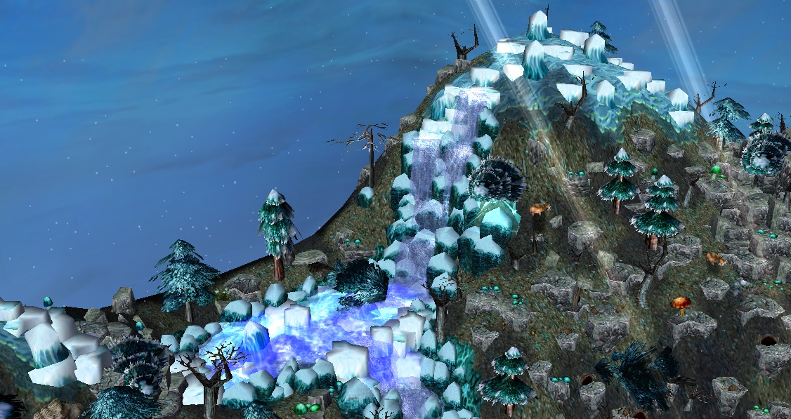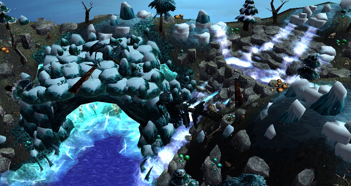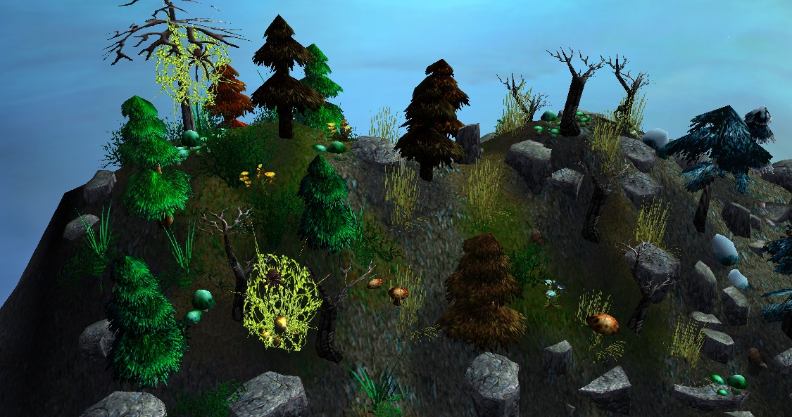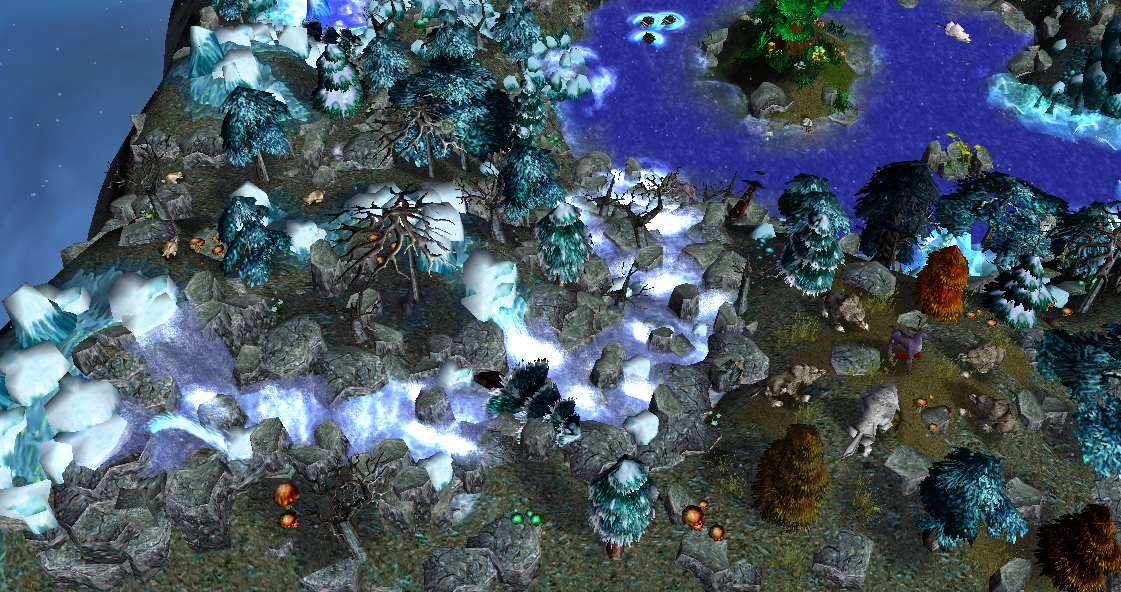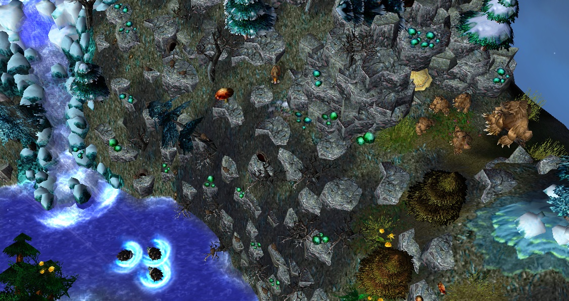 - Центральное озеро с небольшим островом и древним деревом на нем (единственная "теплая" зона на карте).