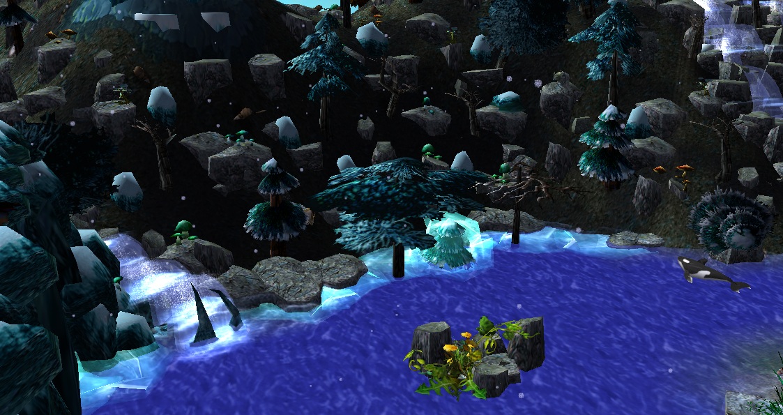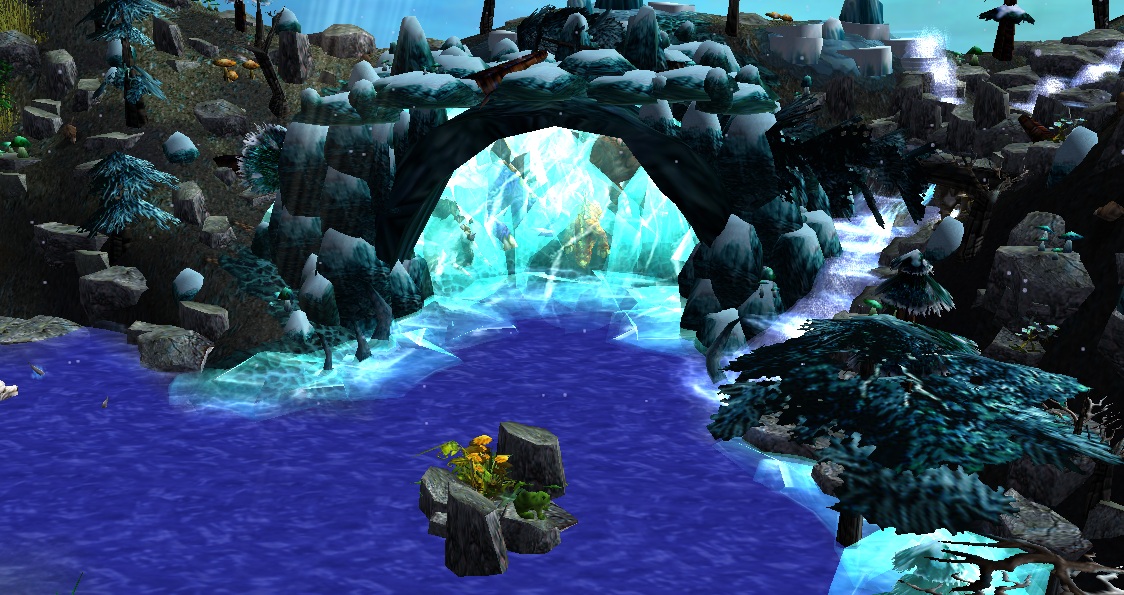 - В центральном озере можно заменить маленький каменистый островок с лягушкой и разросшимся цветком.