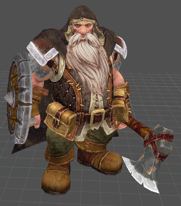 Попробовал сделать из стрелка пехотинца (скачать). Пересадил ему анимации капитана (не пехотинца, потому что у того нет плаща), добавил щит и топор от разбойника. В целом, результат получился удовлетворительным. Мне не понравилась разница в качестве текстур - текстура гнома выглядит все же покачественнее. Но появились недостатки: