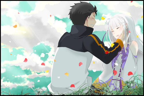 __Эмилия__: Ммм... да, я знаю. Ты любишь меня, Субару. Знаешь, я тааак счастлива, что у тебя такие чувства по отношению ко мне. И ты такооой надежный... что я даже слишком на тебя надеюсь. Просто зная, что ты всегда рядом, я чувствую, что смогу свернуть горы.