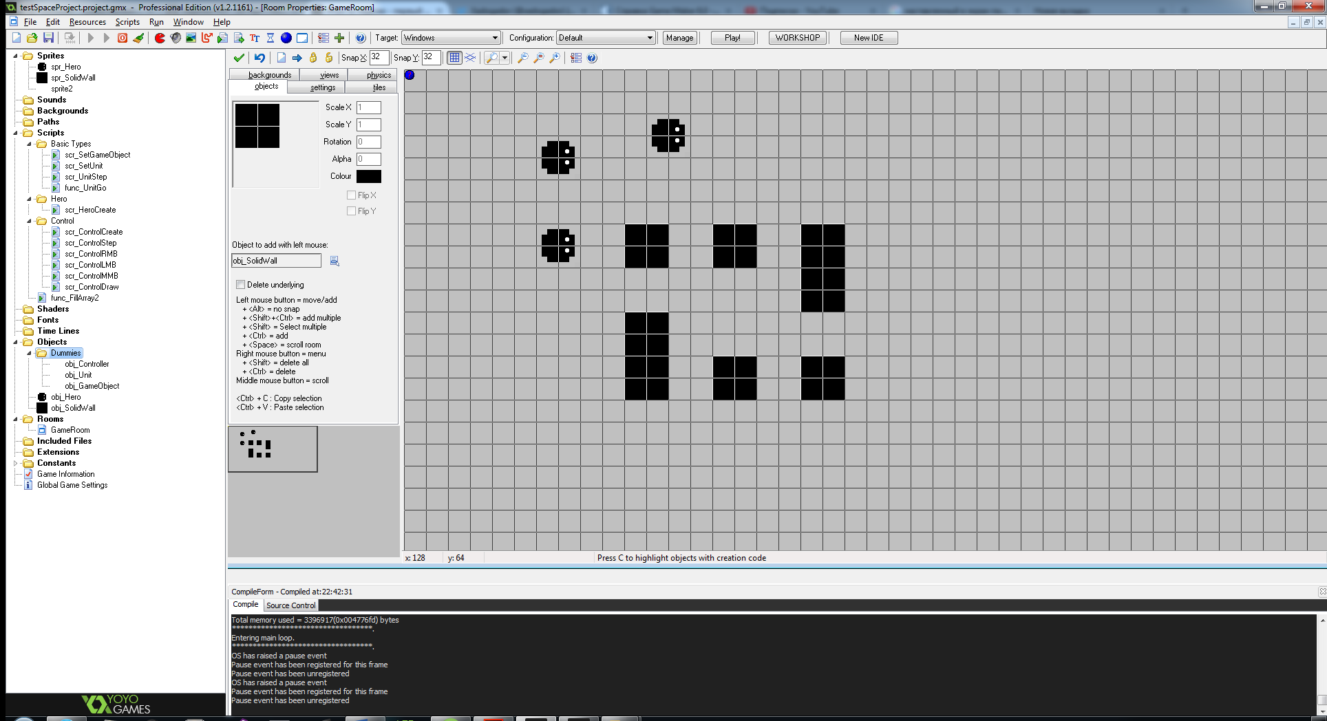 - Я сделал движение персонажа в место щелчка курсором, при этом персонаж не крутится вокруг места, в которое физически не может пройти, что свойственно Game Maker'у