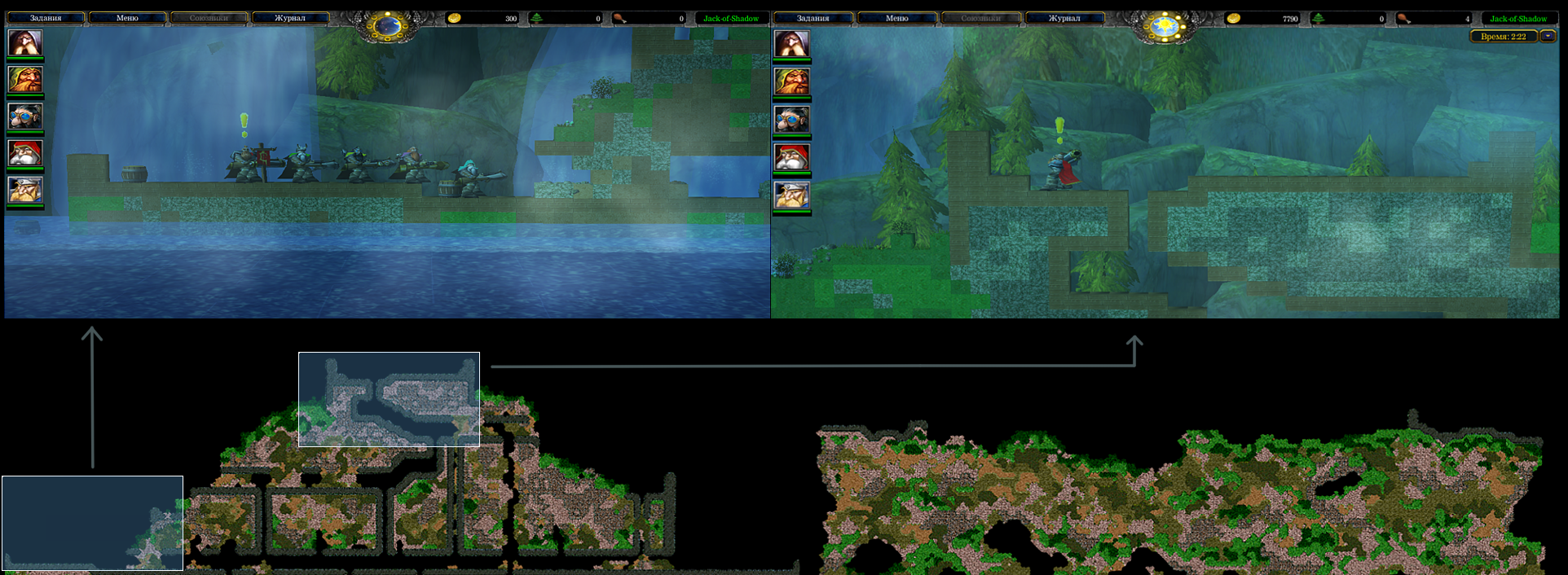 Перед отправкой на конкурс пришлось выпилить ограничение обзора, ибо были некоторые баги. Границы раздвигались от самого левого игрока команды до самого правого. Делать полноценный туман войны тогда времени не было. В дальнейшем надеюсь прикручу его. Пока что есть генераторы тумана, которыми можно скрывать базу от противника.