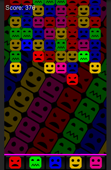 Сверху экрана ползут цветные квадраты. У вас в распоряжении пять (на этот момент) кнопок, по одной на каждый цвет. Каждая кнопка уничтожает все нижние квадраты соответственного цвета, за что игрок получает очки. Вам надо, чтобы квадраты не добрались до линии над кнопками.
