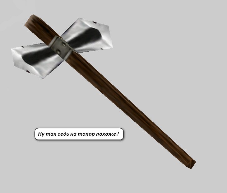 MaJo, топору можно сделать отдельной поверхностью верёвку, которой наконечник крепится к топорищу. + над формой палки поработать, но совсем чуть-чуть. Скажем, сделать, чтобы к концу она немного расширялась.