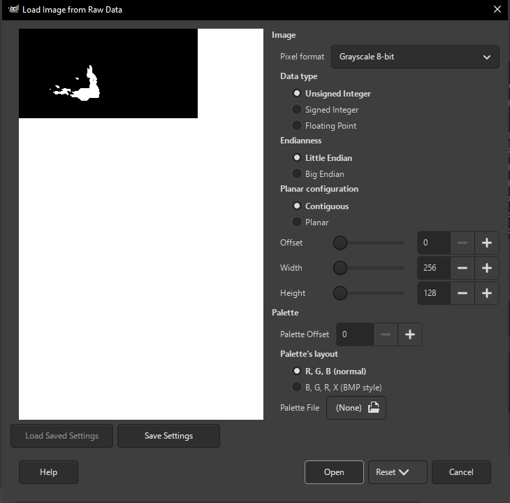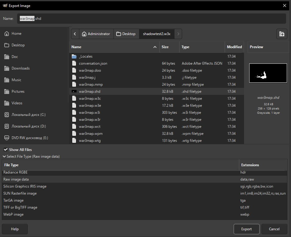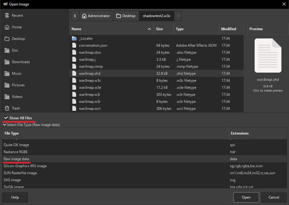 Запускаем GIMP, нажимаем открыть, ищем в списке вариантов Raw Image Data, и открываем shd.