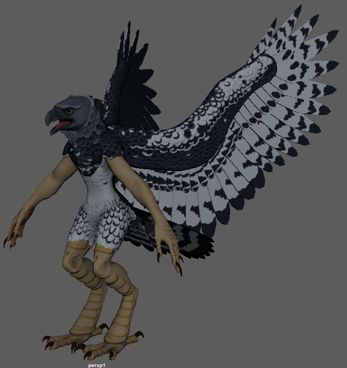 Вот её-то я забьла в пост с прогрессом добавить, но именно в то время я и начала её делать. Как-то в вк увидела комм, что у ангелочков должны были быть мышечные горбы для поддержания крыльев и я подумала, а почему бы и нет. Пока искала рефы, чёт заметила, что за основу дизайна не использовалась южноамериканская гарпия и я подумала, а почему бы и нет (2). По итогу вышло ни там, ни сям, но мне нрав, несмотря на все муки. В основном весь адок связан с детализацией, все маленькие перья это скульпт. Я настолько с ними упоролась, что хайполи вышла где-то на 150 лямов поликов. Скрипя сердцем пришлось урезать, мармосет просто вылетал при запечке. Потом на этапе рига меня приспичило сделать перья на плечах и ногах отдельным объектом, а там уже и голова с шеей пошли под детач. Снова произошёл откат назад, зато ещё чуток доработала детализацию, в 4й раз допилила морду клюва. Риг крыльев это отдельный котёл. У адванседа есть курв гайд для этих целей, но это всё равно звездец.