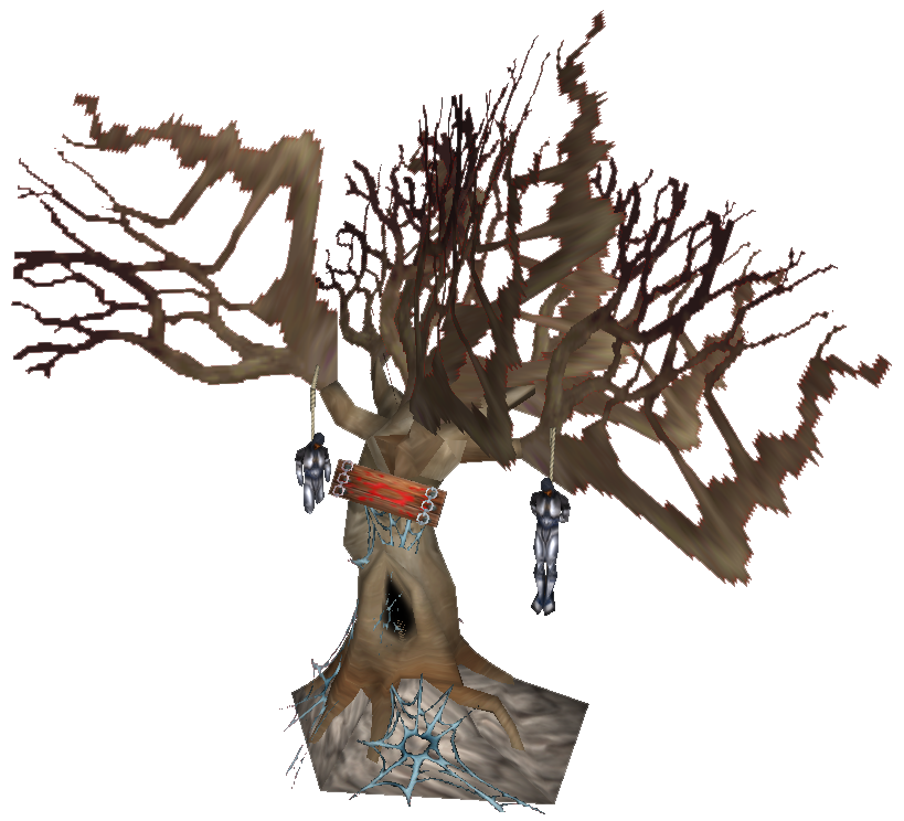 Предупредительное дерево точка МДэКс. Есть вариации. Разная паутина, трупы, камень и древесина. Среди трупов ещё НЭ и упыри.