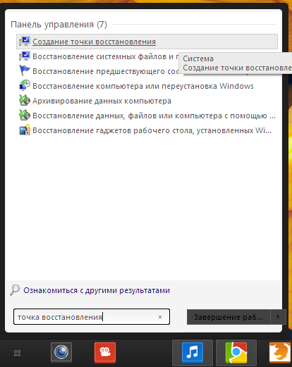 - Нажмите Пуск - в панели поиска наберите точка восстановления, выберите пункт Создание точки восстановления в появившемся меню (первый скриншот).