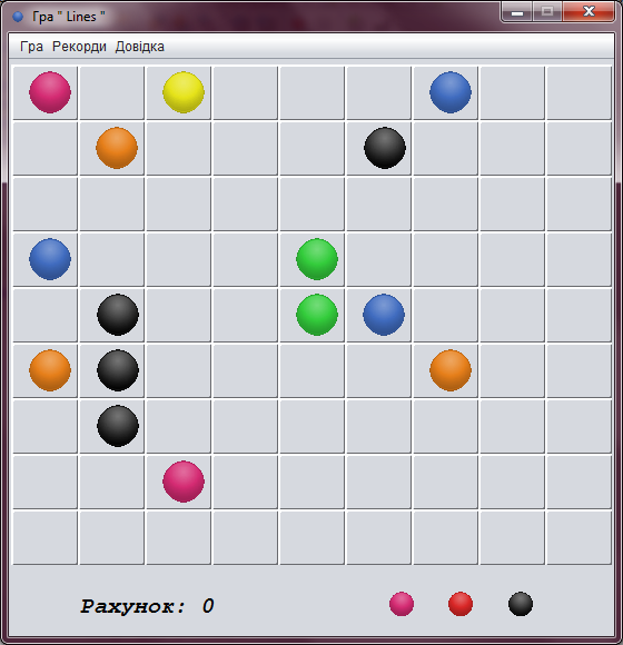 В классической игре на экране показано квадратное поле 9x9 клеток, в случайные клетки на котором программа выставляет три шарика разных цветов. Всего 7 возможных цветов. За один ход игрок может передвинуть один шарик, выделив его и указав его новое местоположение. Для совершения хода необходимо, чтобы между начальной и конечной клетками существовал путь из свободных клеток. Цель игры состоит в удалении максимального количества шариков, которые исчезают при выстраивании шариков одного цвета по пять и более в ряд (по горизонтали, вертикали или диагонали). При исчезновении ряда шариков новые три шарика не выставляются. В остальных случая каждый ход выставляются новые три шарика. Игрок может видеть заранее три шарика, которые появятся в следующем ходу.
