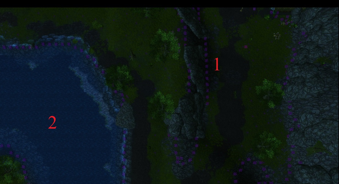 Самая большая заморочка в ландшафте в последнее время - вода. Я решил поднять уровень воды. Но мне захотелось волны на берегах, которые не даёт импорт, Тем более импортная вода хорошо сочетается со стандартной. Однако возникла ожидаемая проблема. Рудник расположен ниже реки, а то означает, что нельзя просто всю карту опустить под воду в нужном месте, а затем поднять все нужны места (см. рис. 1). Тем более некоторые места сделаны настолько хорошо, что делать из них водную гладь не хотелось. От постановки стандартной воды также появлялись некрасивые стандартные клифы. Пришлось всё сглаживать уклоном. Я сделал это. Но работы над ландшафтом, а также интерфейсом (у меня собственный незаконченный нестандартный интерфейс) довольно много.