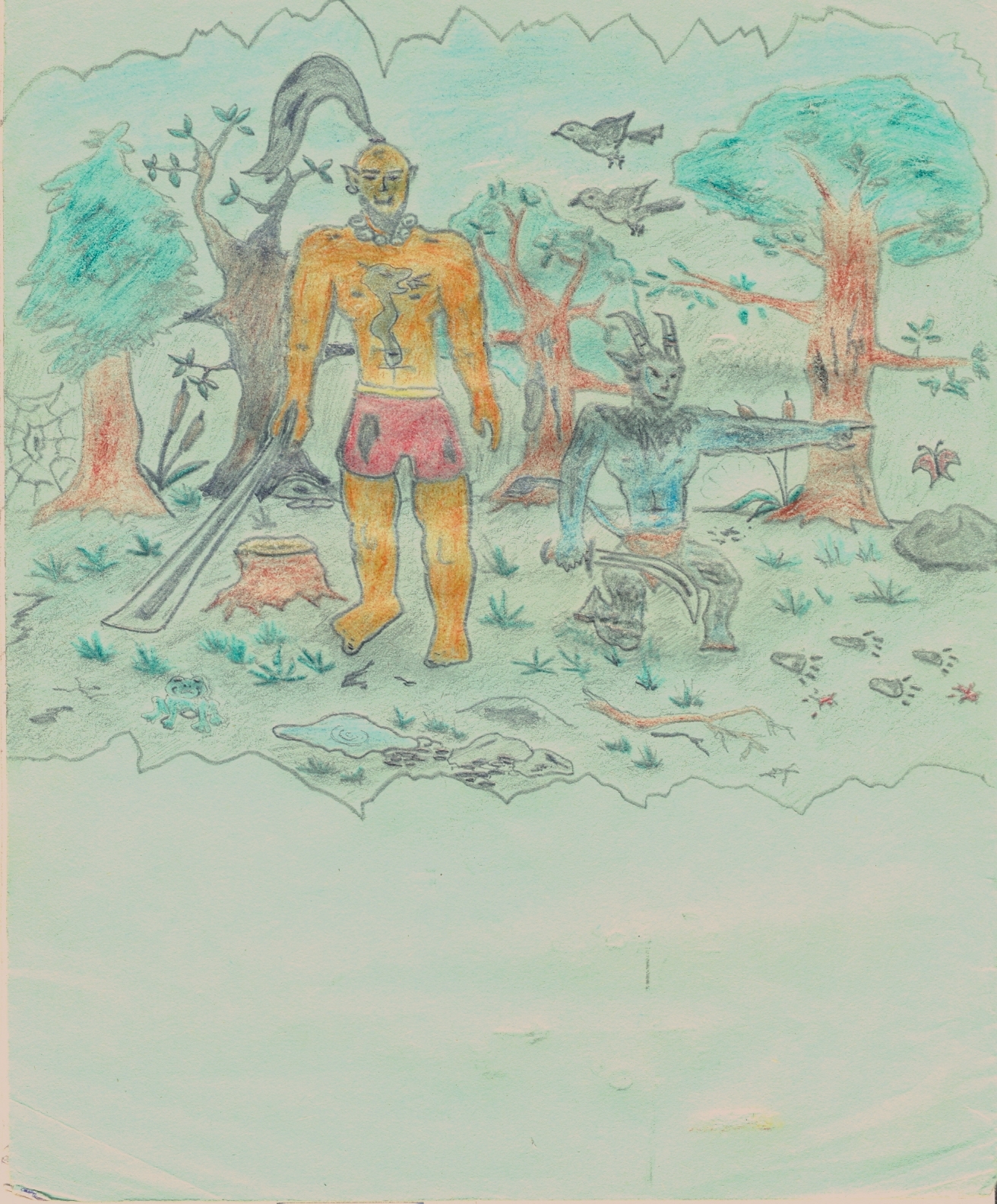 Это одна из моих первых серьезных работ. Все началось с простых набросков моего любимого Juggernaut'a, но потом я пририсовал к нему Rikimaru, лес, а в конце и придумал сцену. На картине показана погоня двух смелых героев за подлым негодяем N'aix'ом, которого они преследуют по следам и крови, текущей из ран вурдалака. Прошу любить и жаловать :)