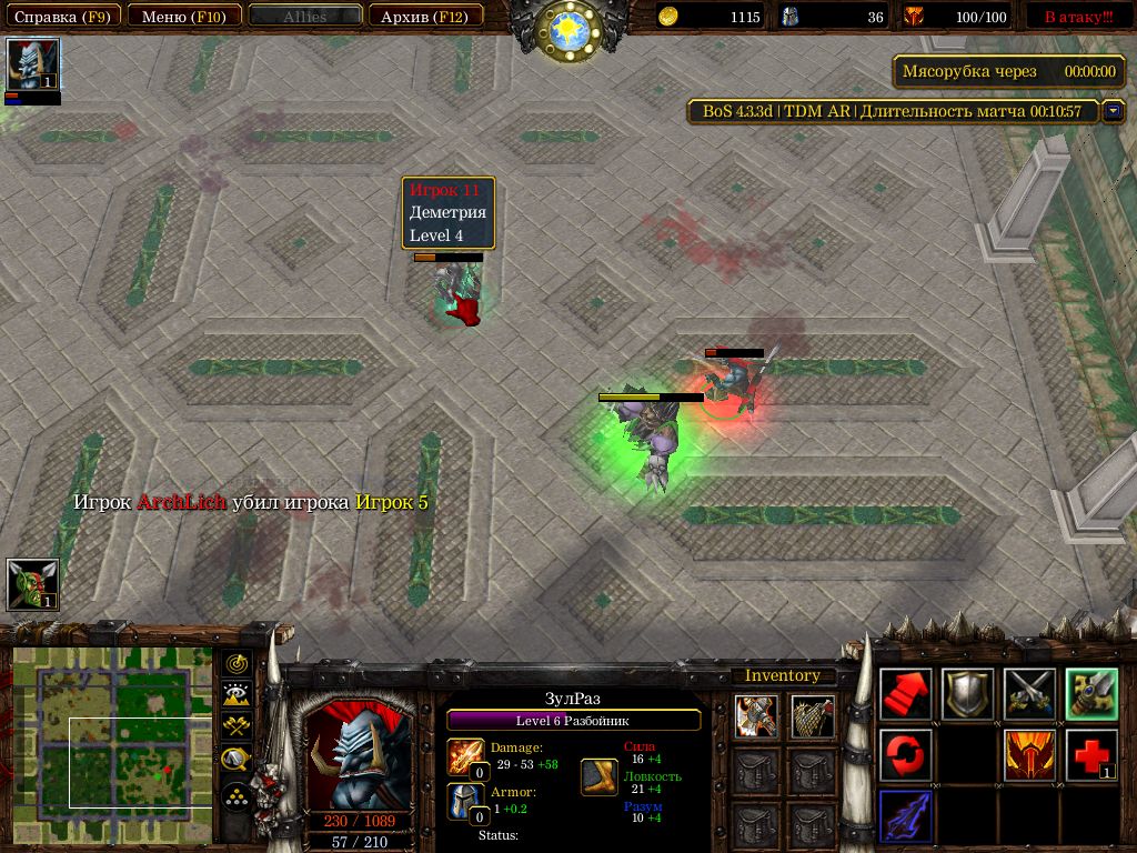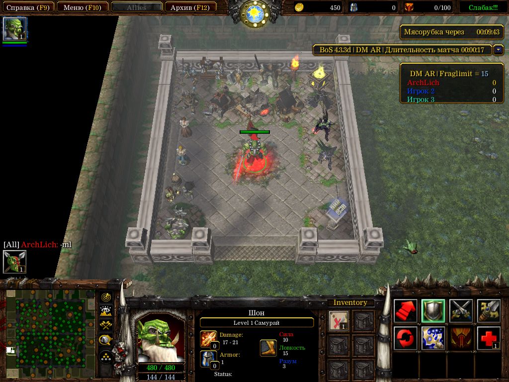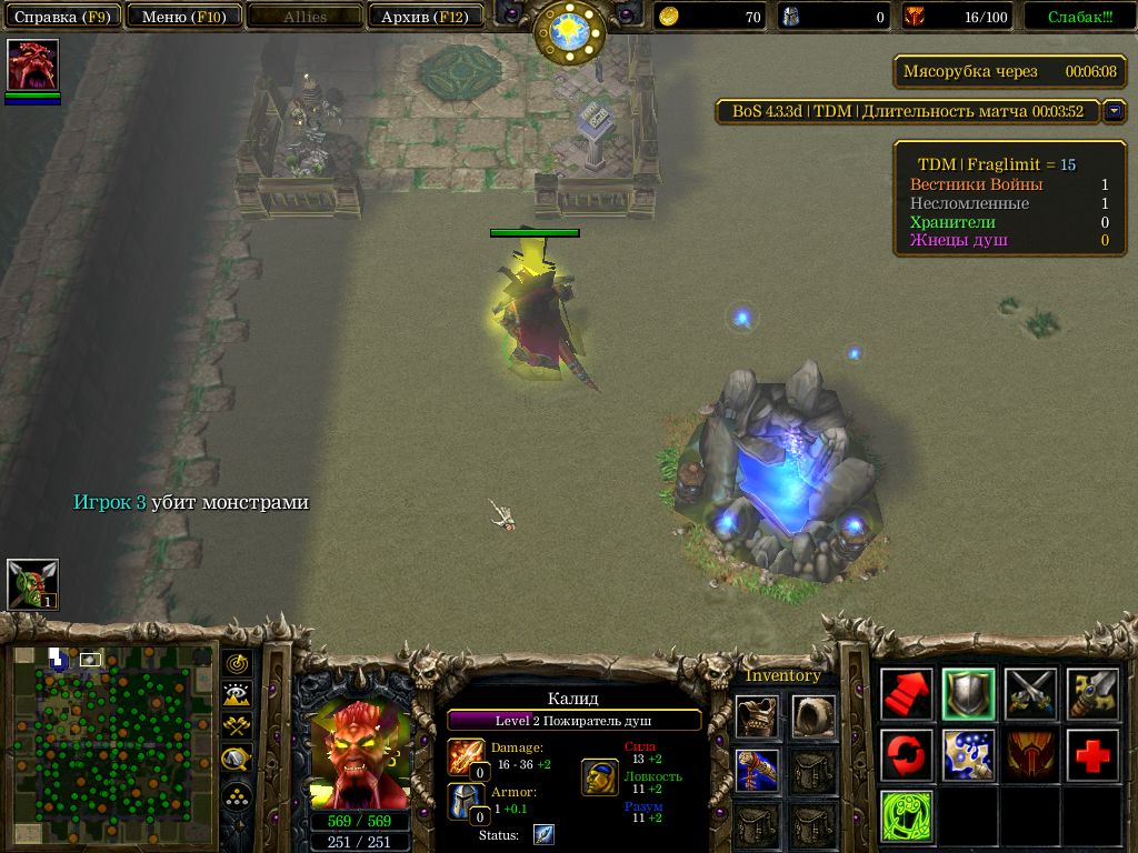 - когда кто-то из команд (TDM) или игроков (DM) достиг лимита фрагов, все герои перемещаются на отдельную арену для поздравления победителей и подведения итогов;