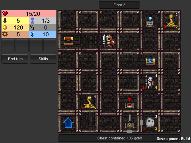 С врагов и желтого сундука падает золото, с синего — артефакт. Между уровнями есть промежуточное меню, в котором можно потратить золото на прокачку характеристик, и активировать артефакты. Последние содержат набор навыков, пассивных или активных (используемых). В одном артефакте можно иметь один активированный навык одновременно. Количество активных навыков ограничено — 4. Размер инвентаря тоже — максимум можно носить 8 артефактов (впрочем, на этот момент просто нет такого количества артефактов). Лишние артефакты можно продать или случайным образом обменять.