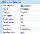 8Direction является основным поведением для движения объектов. Как видно по названию, с его помощью можно заставить объект двигаться в любом из 8 направлений. Также поддерживается функция поворота объекта в сторону движения.