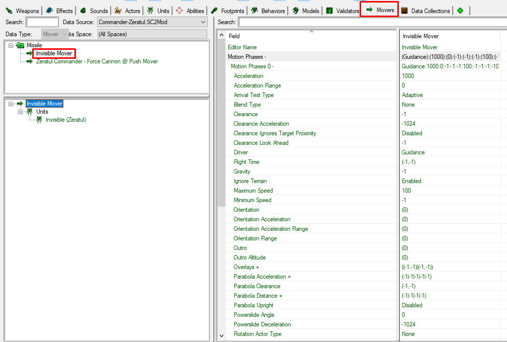 Сперва для этого эффекта нужно задать "патрон" в поле Ammo Unit, которым будет являться наша невидимая единица CC_Invisible (Если у вас на карте уже есть какая-то подобная невидимая единица, лучше укажите её) и в поле Movers указан мувер CC_InvisibleMover, который будет использоваться для запуска этого снаряда.