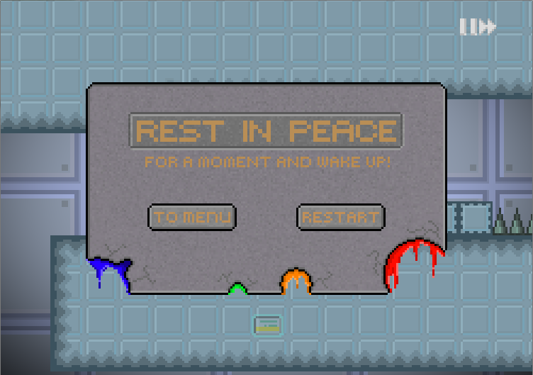 Решились насущные проблемы с физикой, анимациями, цветопушкой, которая предательски тратила заряд, если стрелять в упор к цветной двери, с меню решились проблемы. Вообще я вылизал полтора уровня так за один вечер, что там уже просто не к чему придраться. Этого не хватало как раз для того, чтобы втопить и дальше тупо лепить новые уровни в канву сюжета.