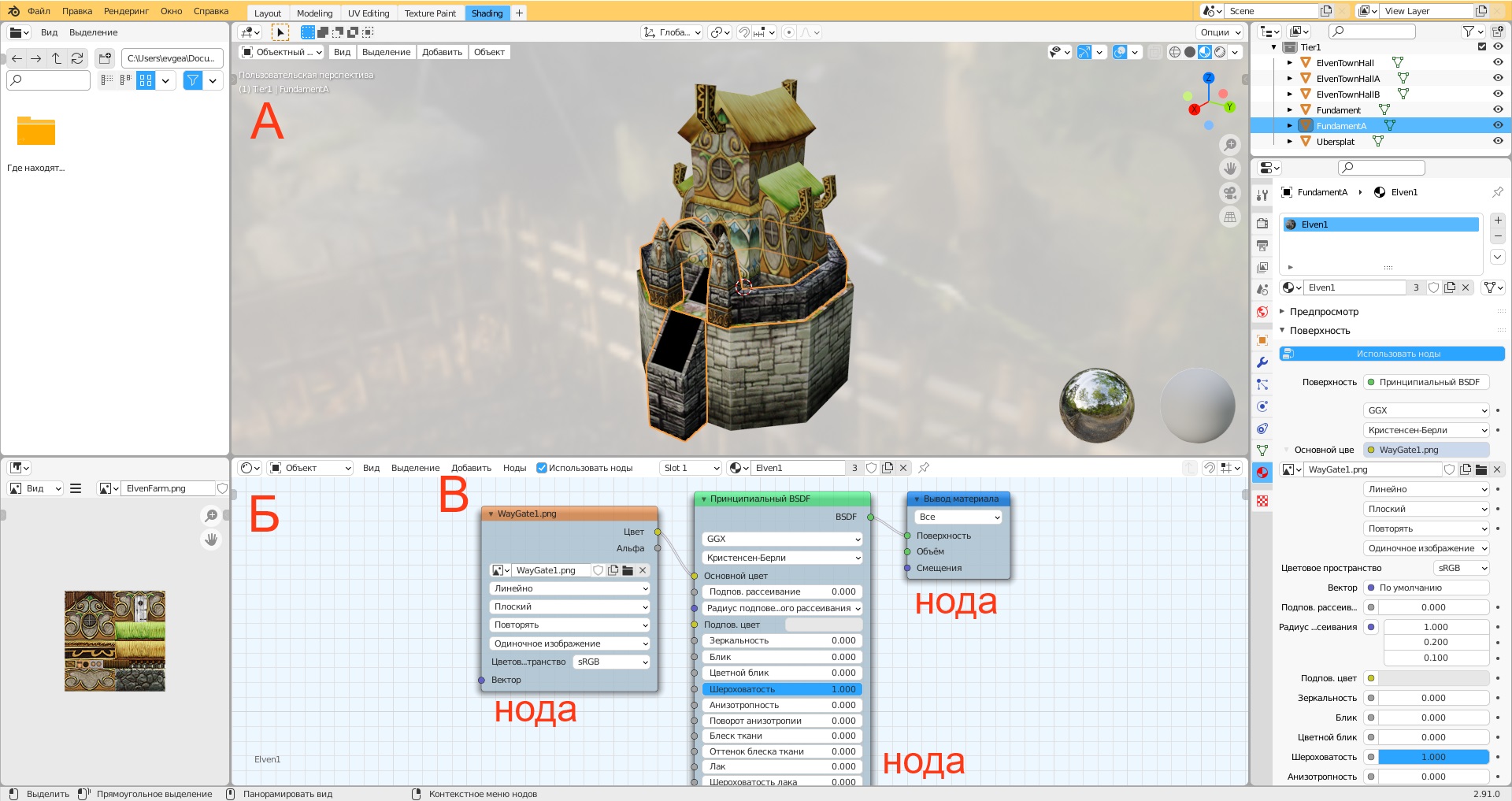 В - Панель нодов и материалов. Вы можете комбинировать разные ноды для изменения материалов и, соответственно, внешнего вида модели.