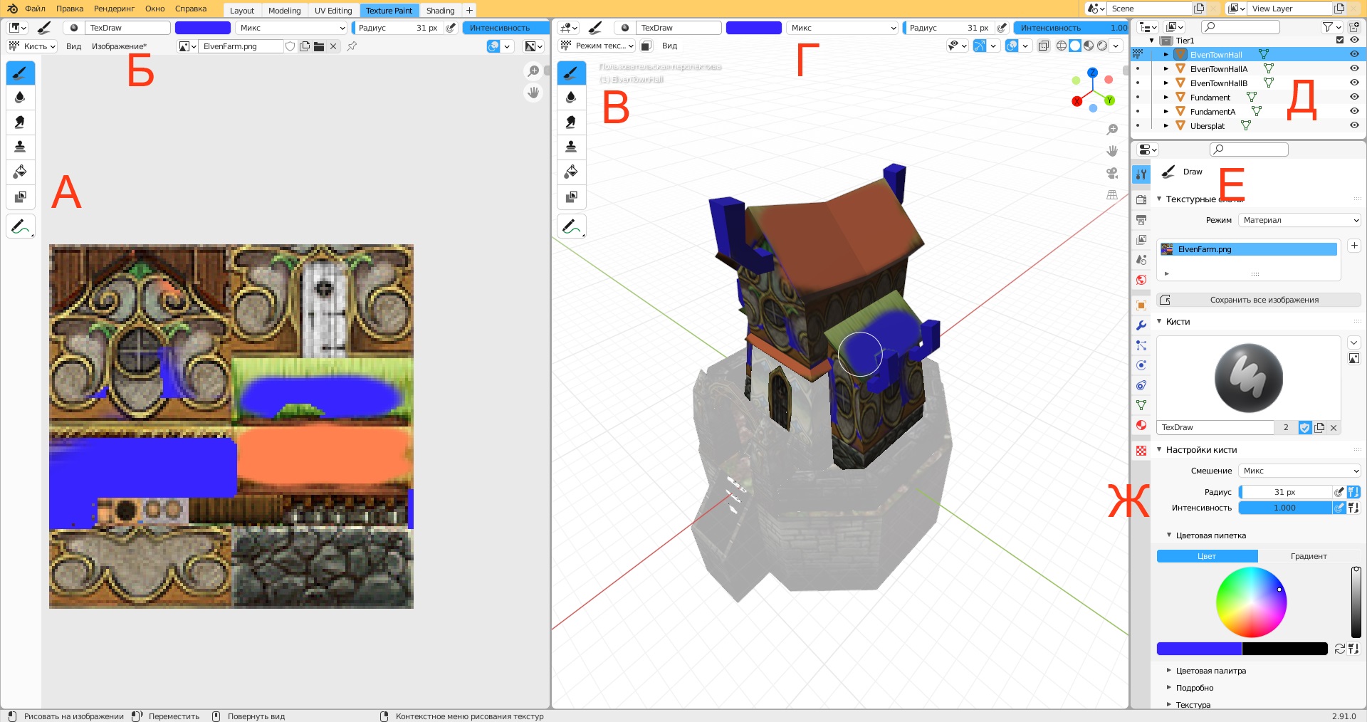 А - Панель кистей. Здесь можно рисовать по текстуре. Изменения будут отображены на модели справа.