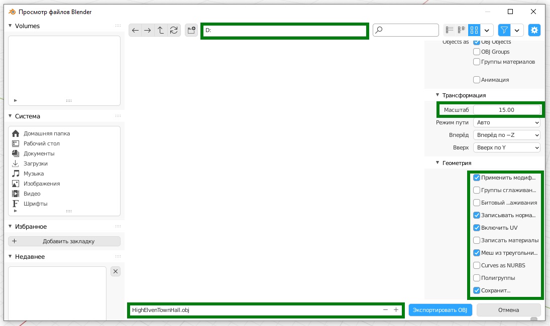 Затем в окне экспорта делаем так, как показано зелёными рамками.