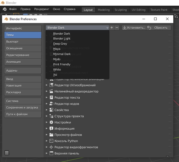 Как видите, блендер имеет много разделов, для каждого этапа работы с моделью.