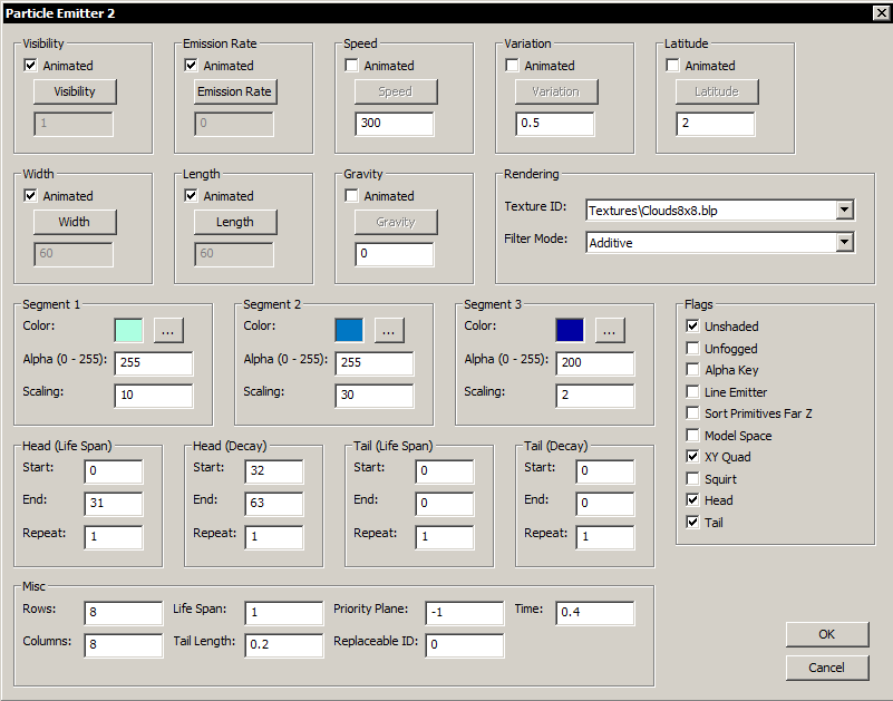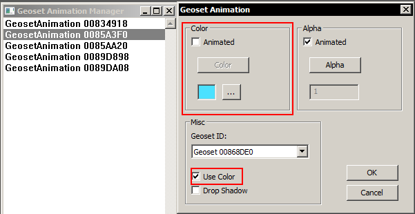 У нас черно-белая текстура, значит и эффект будет черно-белым. Нам нужно задать ему цвет. Цвет задается на каждом «Графическом наборе (Geoset)» свой. Графический набор - данные материала спрайта, на данный момент их 5. Каждый из них отвечает за один спрайт, или же вершину эффекта. Найти сея набор можно в «Менеджере графических наборов (Geoset manager)». В этом менеджере указаны их данные, координаты и прочее, нам для изменения цвета нужен «Менеджер анимации графических наборов (Geoset animation manager)», в нем есть вкладка цвета. Изменяем на тот, который нам нужен - в моём случае, это светло синий. Так же, можно задать изменения цвета по кадрам анимации, для того что-бы цвет плавно менялся по течении анимации.