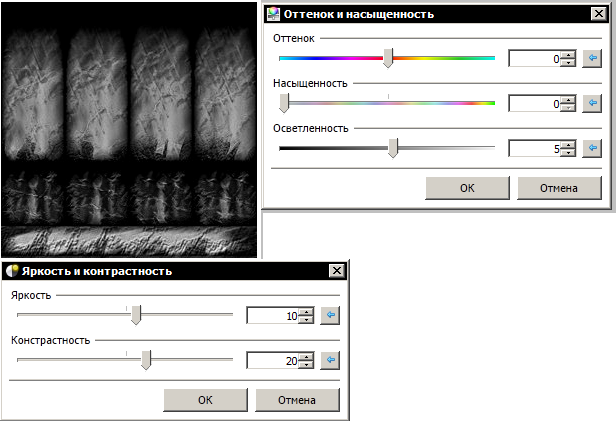Полностью скидываем насыщенность, немного поднимаем осветленность и корректируем на глаз яркость и контрастность. Экспериментируйте со своими текстурами так, что бы сохранился оригинальный рисунок и не был он сильно тусклым, так же как и освещенным.