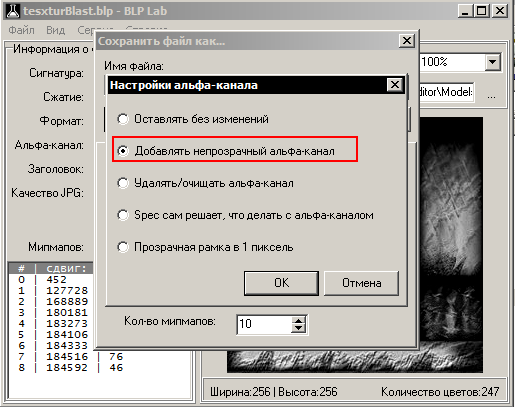 Теперь нашу, новую текстуру сохраняем в формате .blp со 100 процентным качеством и нужными настройками каналов. В моем случае это просто добавление альфа канала: