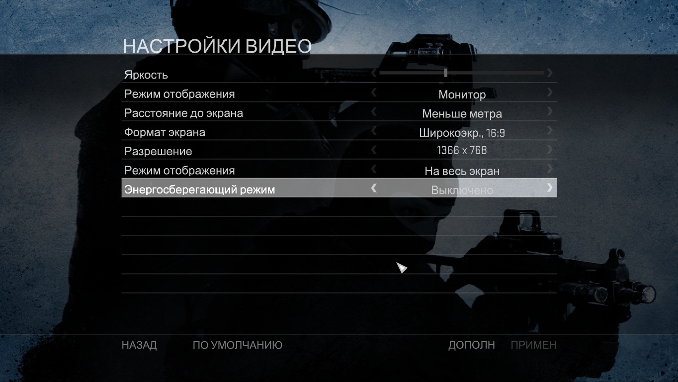 Поскольку мою машину назвать мощной ну никак не получается, я, даже не нажимая на кнопку "Play", залез в настройки. Тут оказалось возможным настроить разрешение экрана, оконный режим, яркость и режим отображения (монитор/телевизор). На что влияет пункт "расстояние от экрана" я, если честно, не понял.