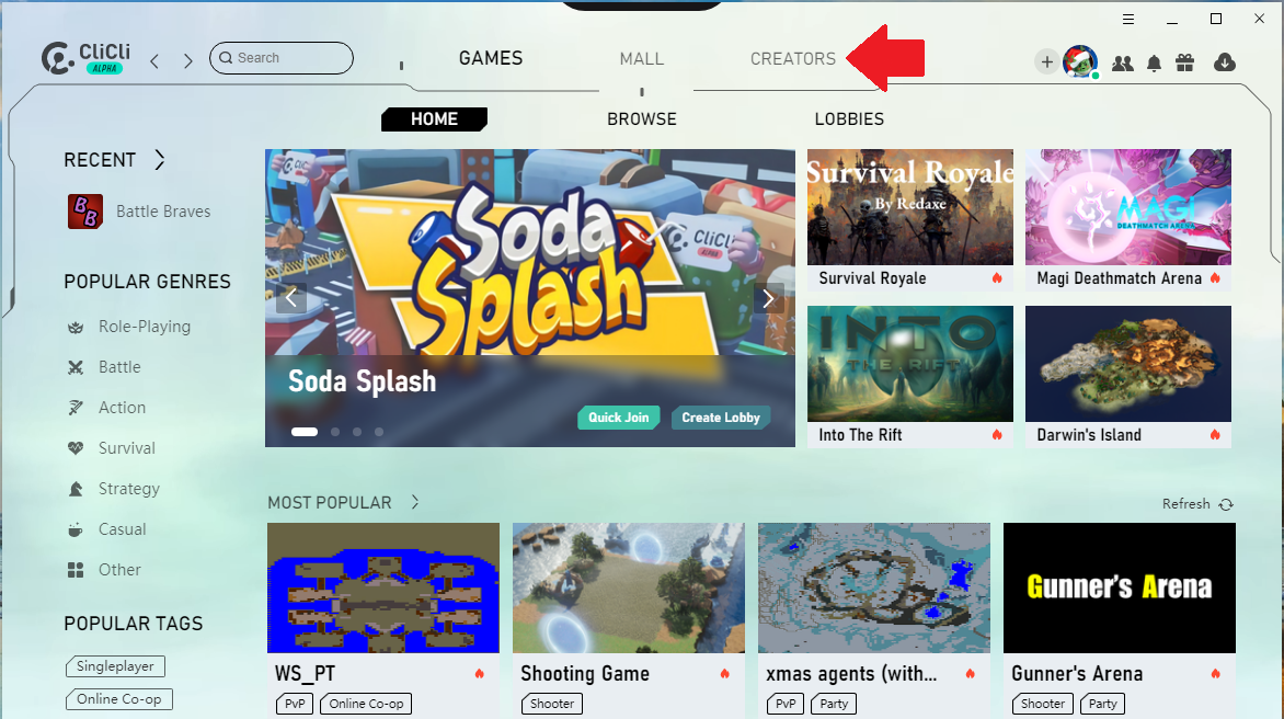 - Нас встречает местный интерфейс. Здесь мы можем играть в различные карты от других игроков. Чтобы перейти в редактор, нам нужно нажать на кнопку "CREATORS".