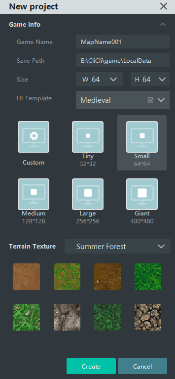 Теперь мы можем создать карту! Для этого нам нужно нажать на кнопку с плюсиком (New Blank Project). Также мы можем создать один из пресетов от разработчиков. После нажатия на кнопку, откроется панель, в которой мы можем настроить размеры карты, изначальный террейн (эти параметры можно будет изменить в процессе редактирования) и шаблон интерфейса (его нельзя изменить на один из других в процессе редактирования, но можно изменить вручную в редакторе UI).