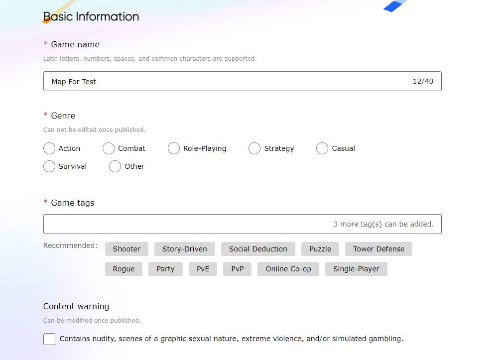 В режиме загрузки игры мы добавляем публичную версию на платформу. В отличии от мультиплеерного режима, карта будет проходит проверку несколько рабочих дней, после чего станет доступна для всех желающих на платформе. Карта не будет допущена, если будет нарушать правила платформы.