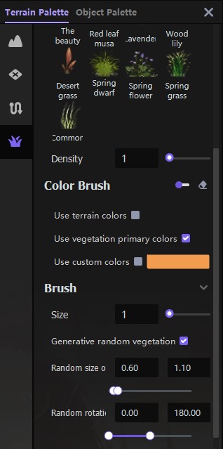 - Generation random vegetation - включение галочки даёт возможность задать случайный размер и угол поворота для растительности.