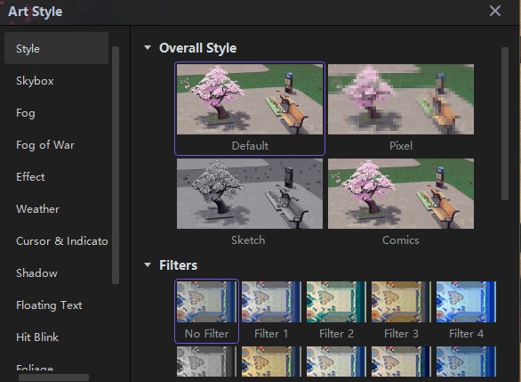 Откройте окно Art Style в меню Advanced. В разделе Style можно выбрать различные графические настройки, которые придадут вашей игре особый вид. Для создания пустынной атмосферы выберем Filter 6. На вкладке Weather тоже можно задать погоду, но она применится ко всей карте.