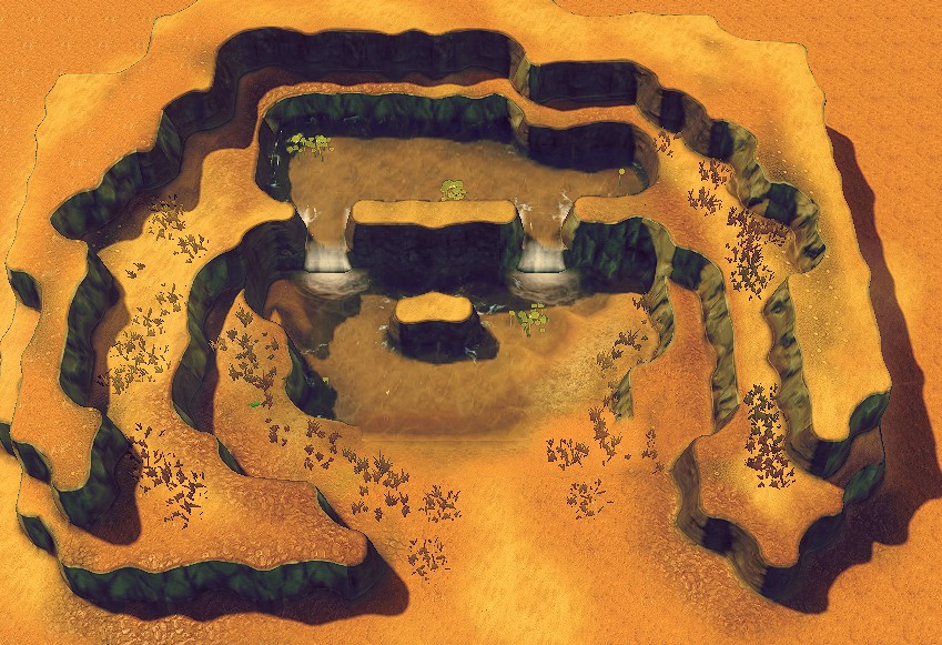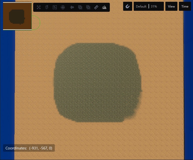 Для создания оазиса сперва изменим всё окружение на песок. Выбираем текстуру Dirt 4, задаём ей максимальный Size и Strength, и распыляем на всю область карты. По центру карты создаём круг с помощью текстуры Grass 8.