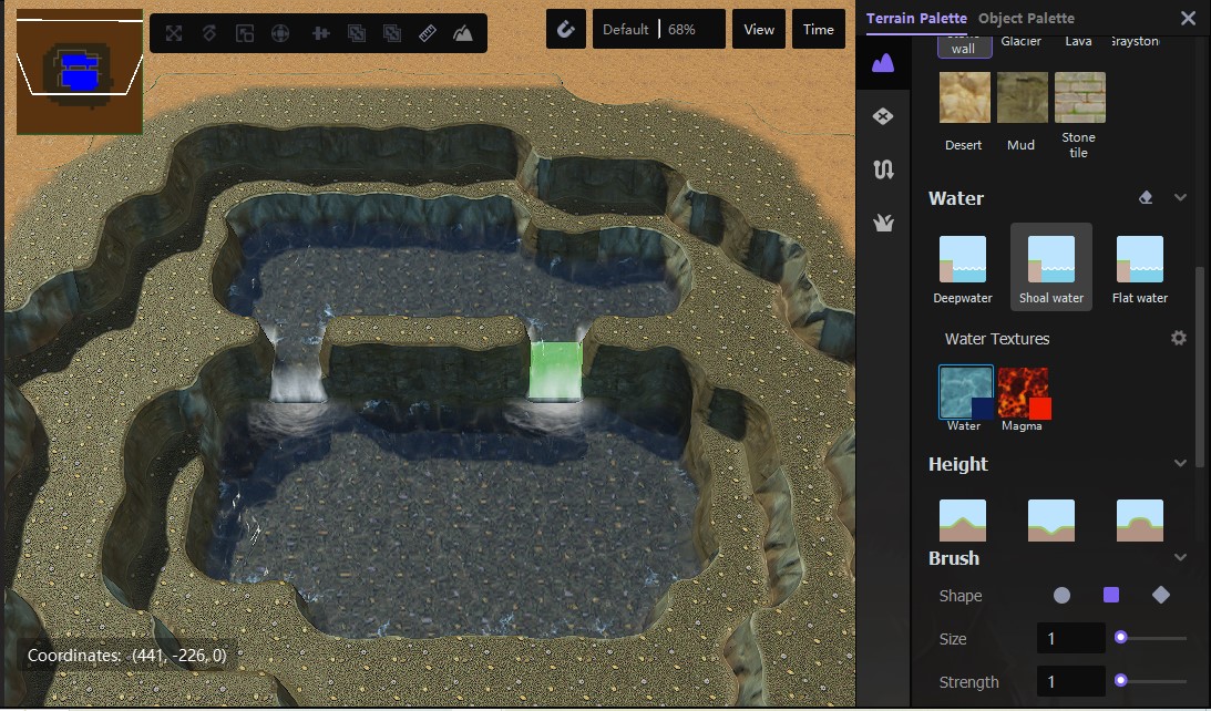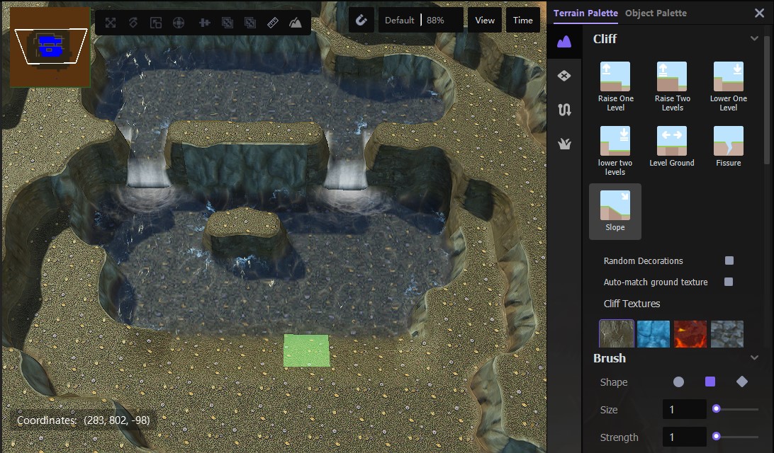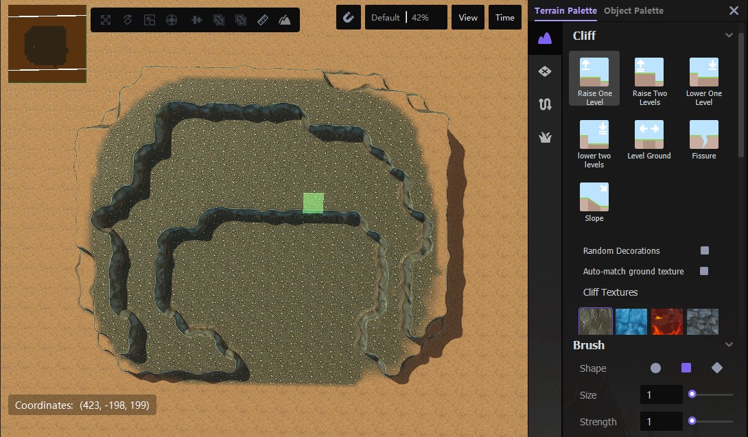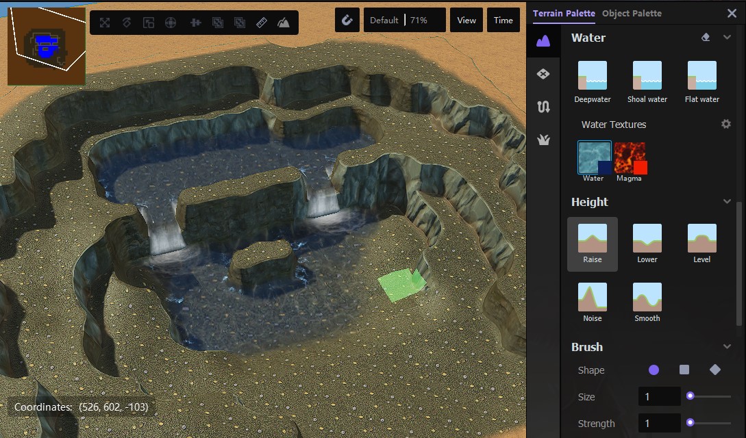 Переключитесь на вкладку Topography (T) , чтобы переключится на режим редактирования рельефа. Создайте возвышенности по окружности на один и два уровня по высоте.