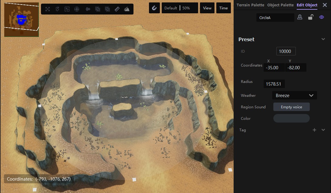 Выбираем __Circle __и создаём область в нашем оазисе. Далее открываем настройки области и в опции __Weather __выбираем погоду __Breeze __для создания эффекта лёгкого ветра.