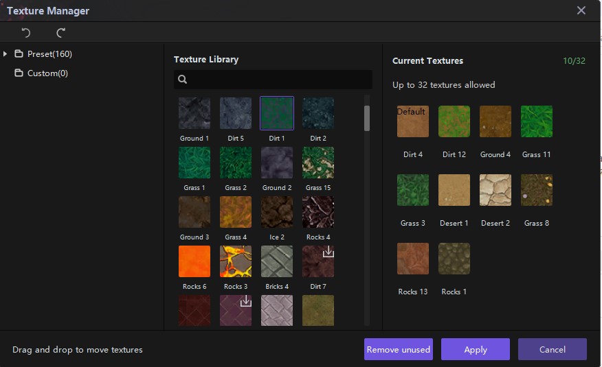 Перед вами откроется окно настройки текстур. С правой стороны будут отображаться ваши текстуры, а слева библиотека доступных текстур. Некоторые текстуры нужно скачать, для их загрузки нужно нажать на соответствующий значок рядом с иконкой текстуры. Для добавления текстуры зажмите левую кнопкой мыши и перетащите её в правое окно.