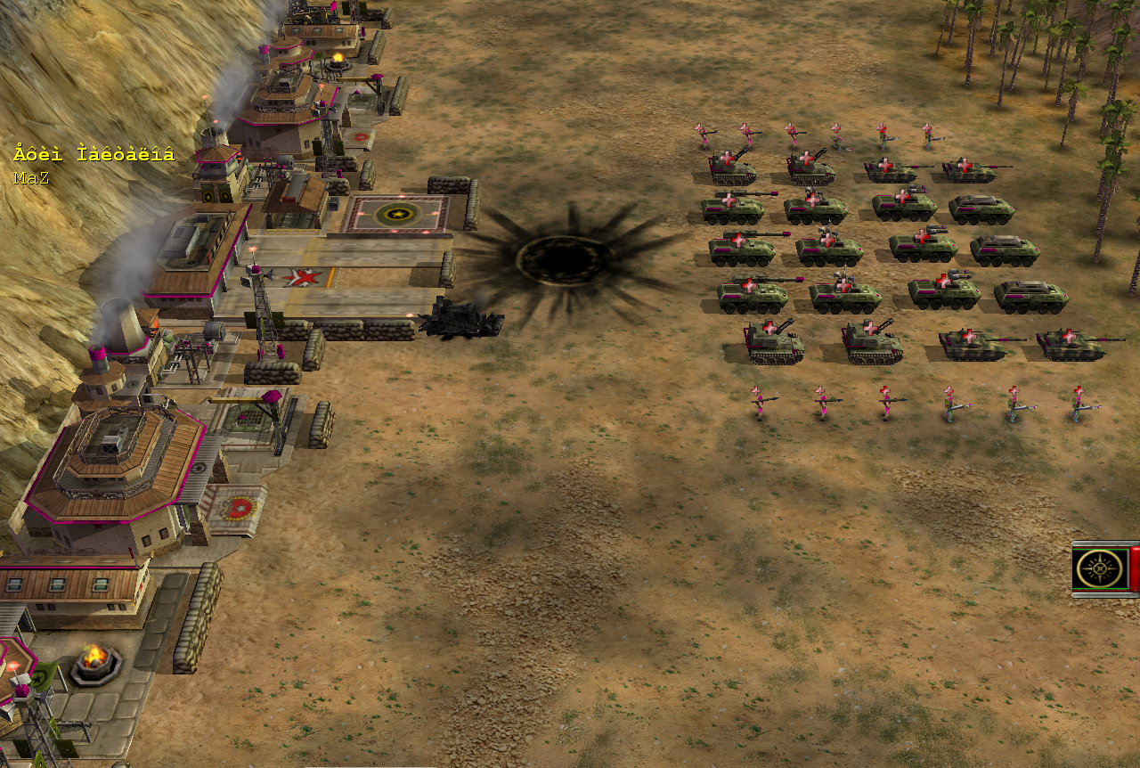 Карта на 2 игроков (без ботов), как раз для выяснения отношений "кто круче". У каждого игрока будет база и небольшое количество войск для начала. У игроков полностью одинаковые условия. Строителей и суперюнитов не будет. Сама карта довольно обширная, места для маневров хватит. На базе игроков стоит по 2 нефтевышки у каждого, и за пределами базы расположены еще 4 нефтевышки и одна нефтебаза.
