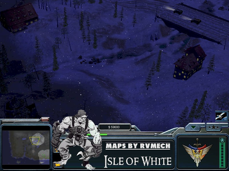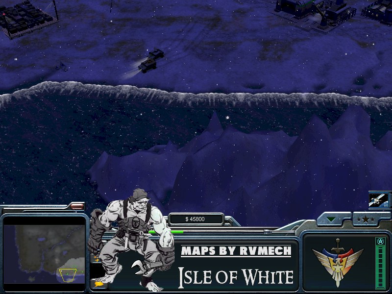 Mountains and a frozen river divide the land in this 2-player Snow map (with snow storm) set at night with a tint of blue. The river in the map appears to have ice over it as well as a thick layer of snow. You may need your game set to high detail to see this however. You'll also find two frozen ponds making up the landscape. There's adequate resources and tech structures to be discovered at various locations. Good amount of room to build and expand your base. Waves along the beach areas and icebergs offshore add interest and realism. Enjoy the map!