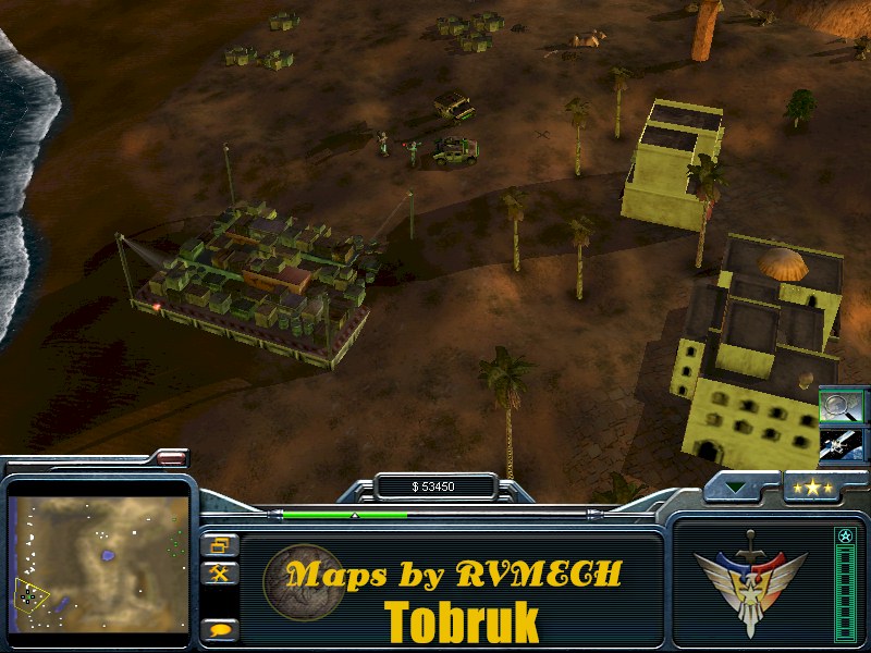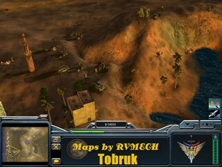 This is a 4-player asymmetrically designed map for online play, but can be used for skirmish games as well. Lighting is set for late afternoon, and the scenario is the deserts of North Africa. You'll find a variety of tech buildings spread about the map, and several small villages as well. Terrain is mountainous with a beach area located to the west. Adequate funds to build a good sized army. Good amount of room to build if utilized wisely. Enjoy the map!